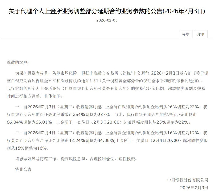 针对白银延期合约,自2026年2月3日(星期二)收盘清算时起,上金所白银延期合约保证金比例从26%调整为23%,中国银行白银延期合约的保证金比例乘数由254%调整为287%。由此,该行白银延期合约的客户保证金比例由66.04%调整为66.01%,上金所下一交易日(2月3日20:00)起涨跌幅度限制从25%调整为22%。